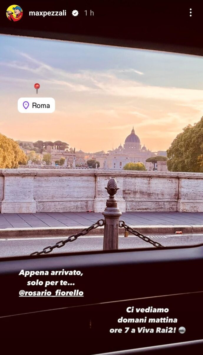 Max Pezzali ha annunciato sui social che ha appena raggiunto Roma per incontrare Fiorello nel programma mattutino "Viva Rai 2". Lo ha fatto attraverso una storia su Instagram in cui ha fotografato una parte della città eterna ed ha mandato un messaggio al suo amico showman: