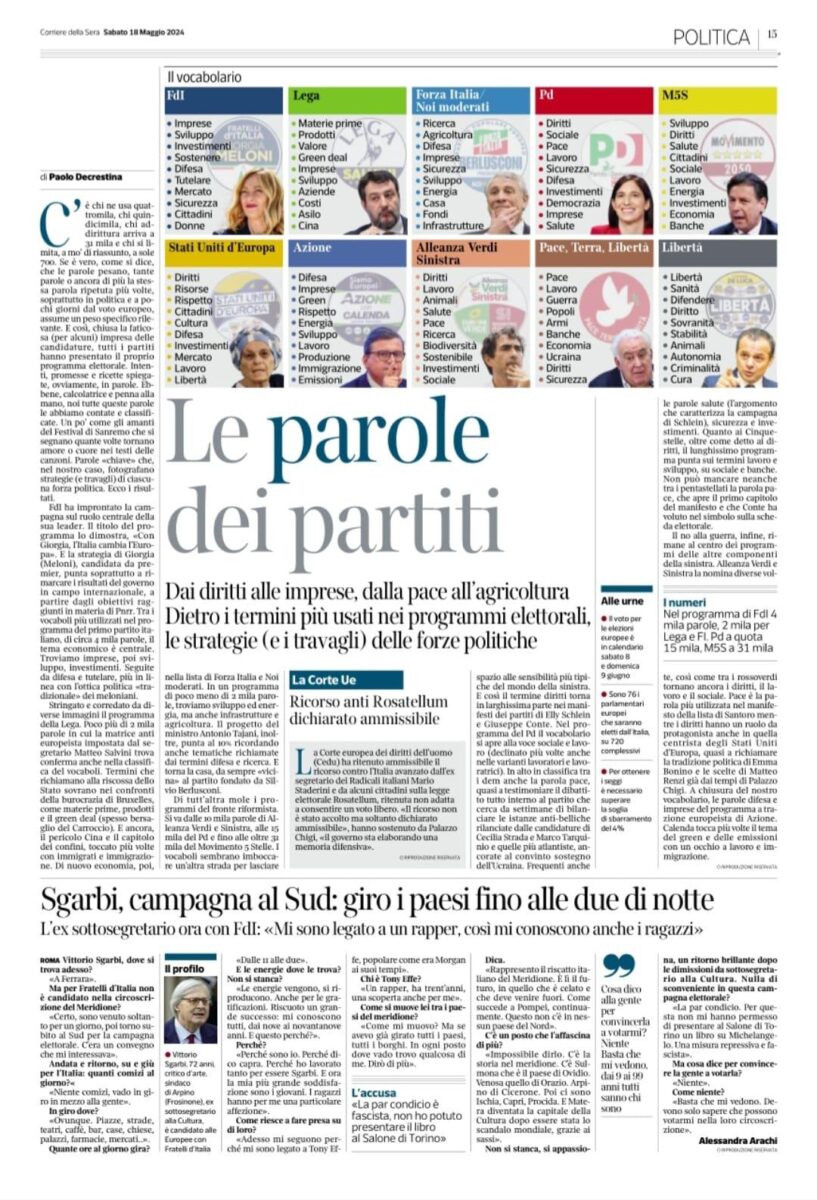 Già perché, a meno di venti giorni dal voto delle Elezioni Europee che il giornale più importante d'Italia, il Corriere della Sera, esca a livello nazionale (quindi mondiale ndr) con una pagina e un pezzo dal titolo "Le parole dei Partiti", dove ci sono tutti i partiti regolarmente e legalmente iscritti nelle cinque circoscrizioni. Peccato però che ne manchi uno e, questa volta, considerato il ripetersi della situazione, non tanto dal CorSera, ma da tanti altri, per non dimenticare i sondaggisti che non sondano AP, viene da pensare male.