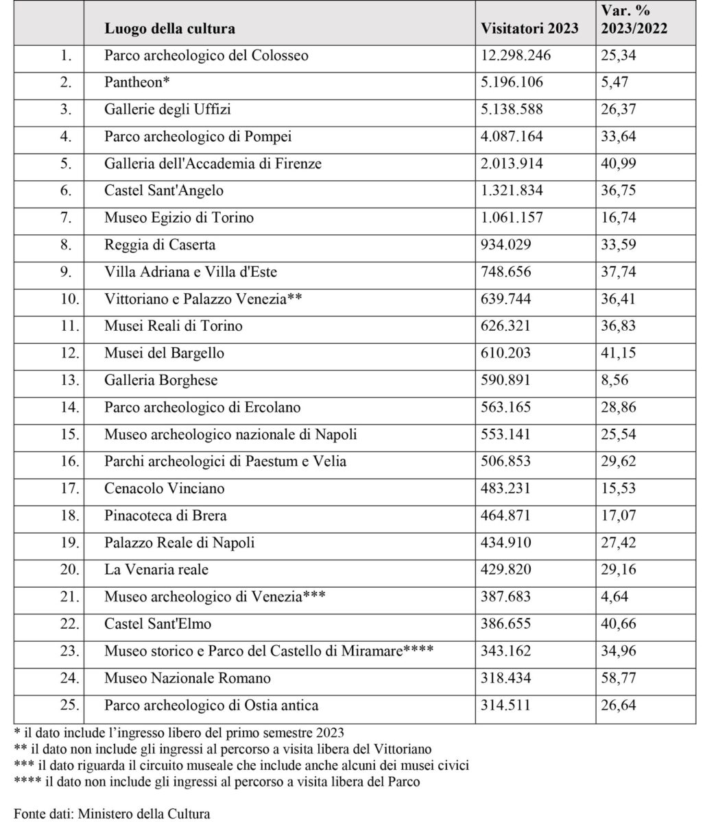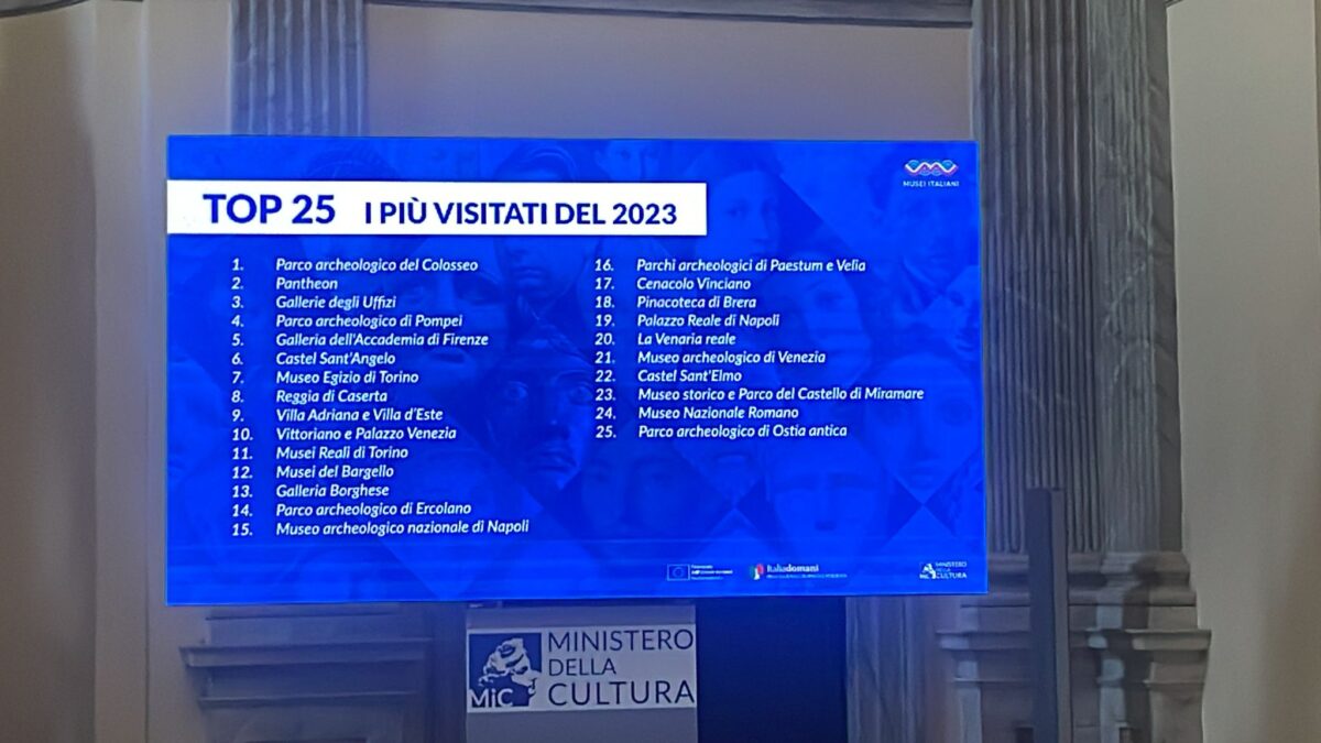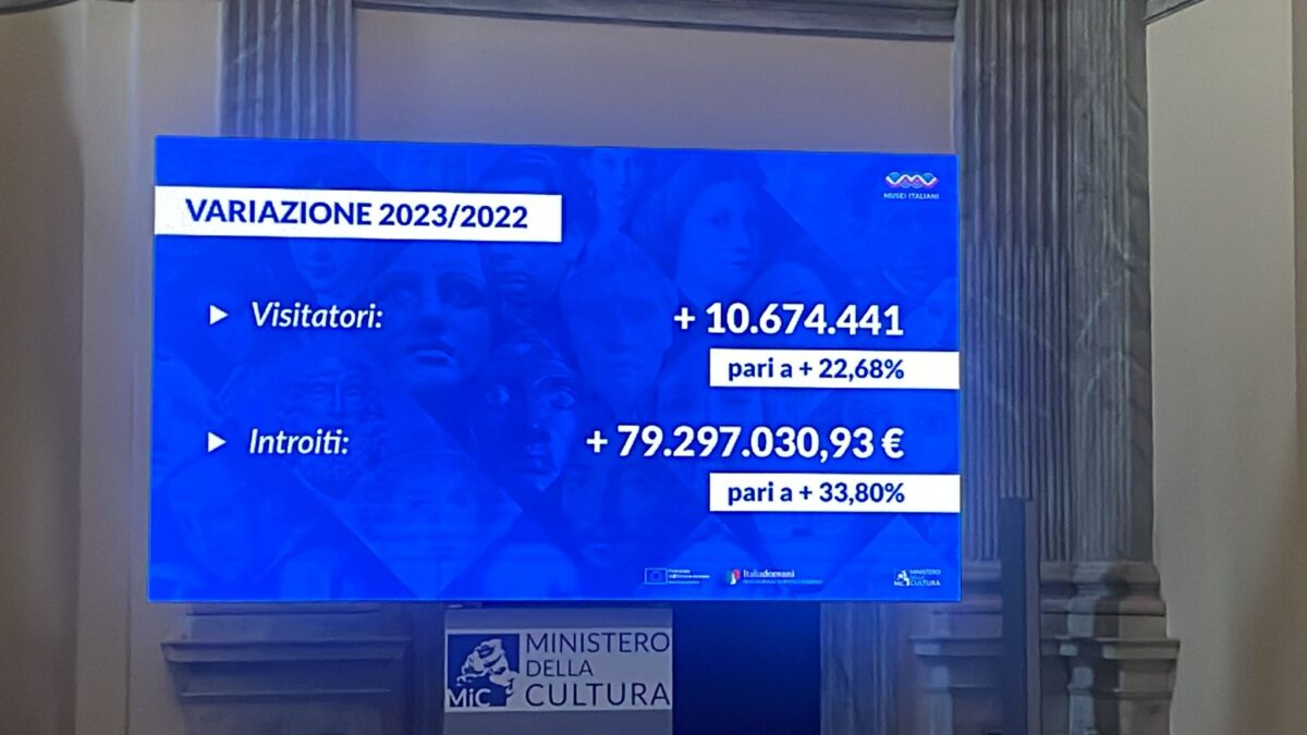 Il ministero della Cultura ha indicato che "il numero assoluto di visitatori ha raggiunto nel 2023 il record di 57.730.502 visitatori, mai registrato nelle serie storiche". Massimo Osanna, il direttore generale dei Musei, si dice contento di questi numeri, indicando che l'Italia può contare rispetto ad altri paesi europei e non su un insieme di eccellenze artistiche difficilmente eguagliabile: