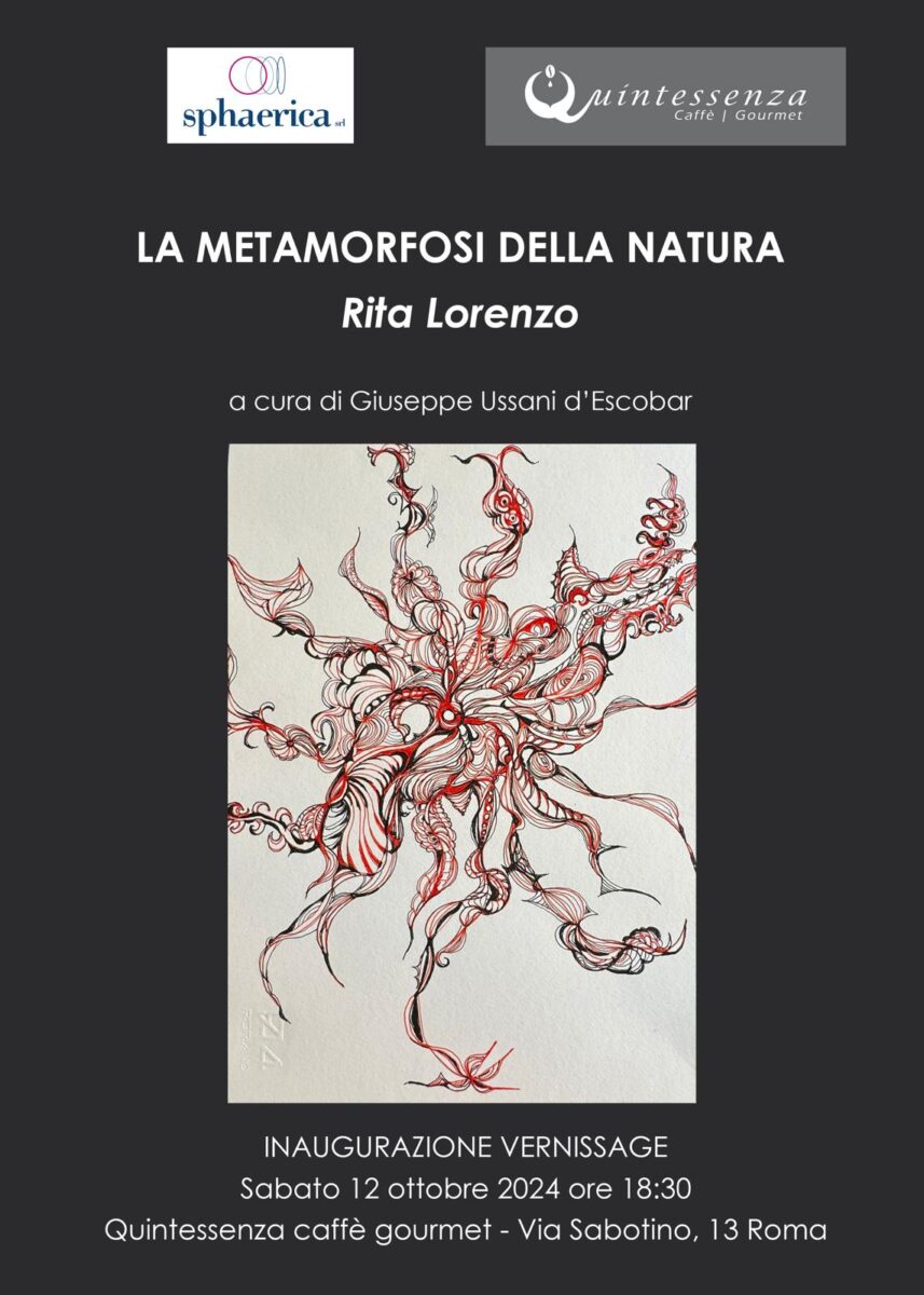 La mostra La metamorfosi della natura di Rita Lorenzo sarà inaugurata alle 18:30 del 12 ottobre 2024 e terminerà il 12 dicembre 2024. La location scelta per l’evento è Quintessenza caffè gourmet, che spesso ospita esposizioni artistiche e concerti jazz, in via Sabotino 13 a Roma.