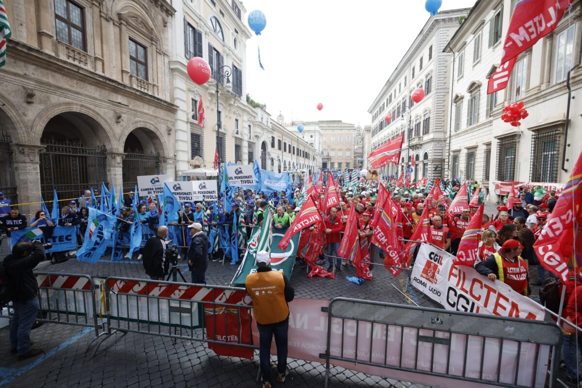 In piazza Santi Apostoli, a Roma, si sono recati oggi 25 ottobre 2024 centinaia di manifestanti del settore della componentistica della filiera non metalmeccanica dell'automotive. Lo sciopero è durato per otto ore e il corteo di questa mattina è stato proclamato dalle tre principali sigle sindacali: Filctem Cgil, Femca Cisl e Uiltec Uil.