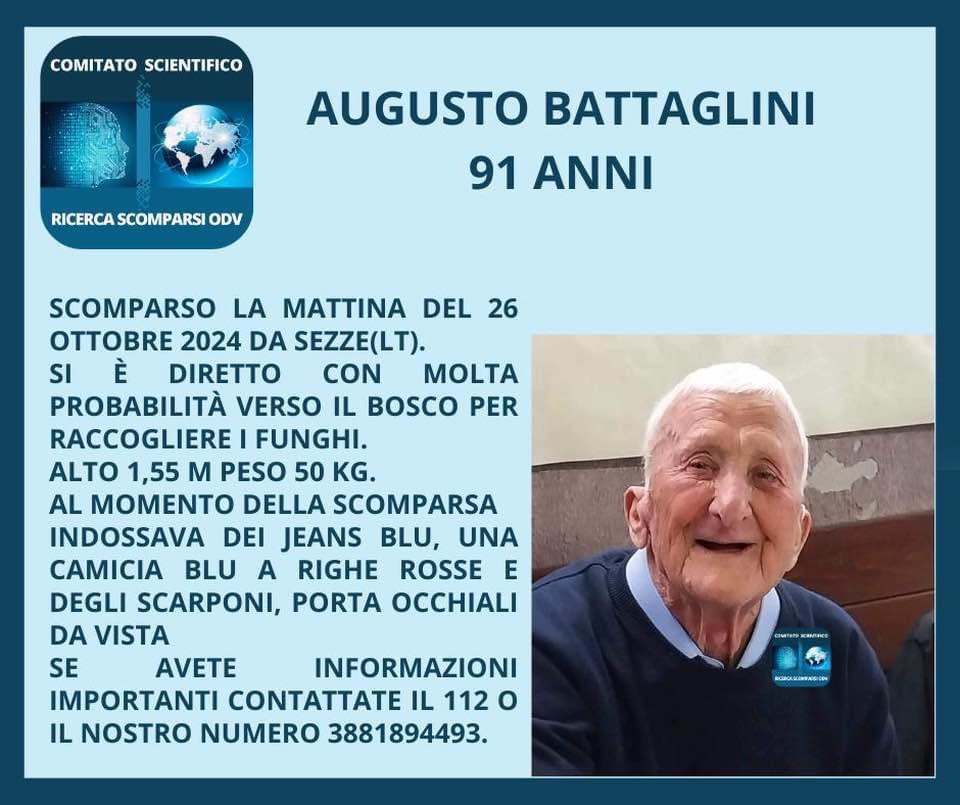 Augusto Battaglini è scomparso nella mattina del 26 ottobre da Sezze, in provincia di Latina. Capelli bianchi, corti, senza barba. È una persona conosciuta e ben integrata all'interno del tessuto della comunità locale e conduce una vita semplice.