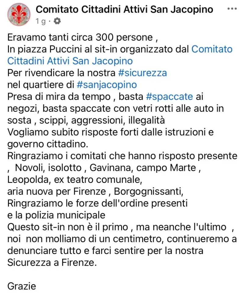 Sabato 18 gennaio 2025 erano in tanti, persone venute da ogni parte di Firenze per lanciare, ancora una volta, un grido di allarme sulla sicurezza. Il Comitato cittadini attivi San Jacopino ha riunito centiania di manifestanti in piazza Puccini e alcune associazioni di residenti, dall'Isolotto a Gavinana, da Borgo Ognissanti alla Leopoloda, da Novoli a Campo di Marte.