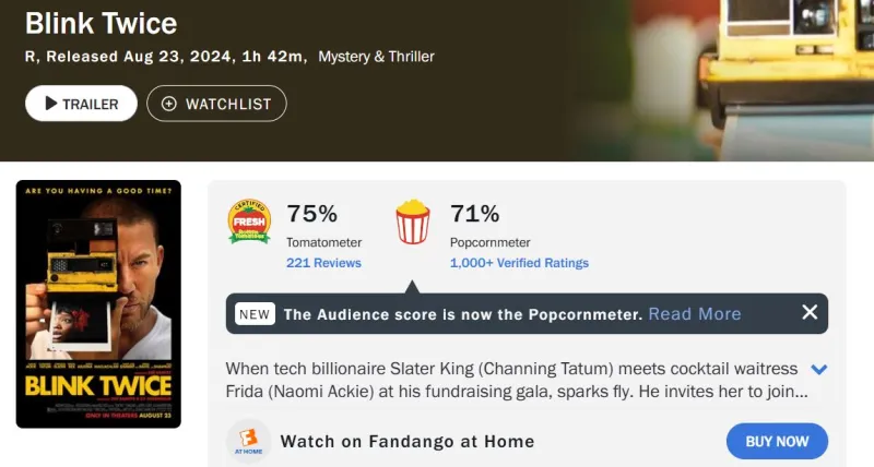 Con una valutazione del 75% su Rotten Tomatoes, Blink Twice è assolutamente da vedere.