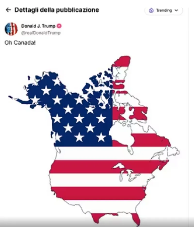 Ebbene sì, perché restando in tema, il presidente americano nelle ultime settimane ha chiaramente avanzato l'ipotesi di 'riunire' il Canada agli Stati Uniti, completando così la cartina dell'America settentrionale, che insieme alla Groenlandia sarebbe tutta a stelle e strisce, garantendo al Governo di Washington il controllo diretto dell'isola nordamericana e dei suoi traffici commerciali.