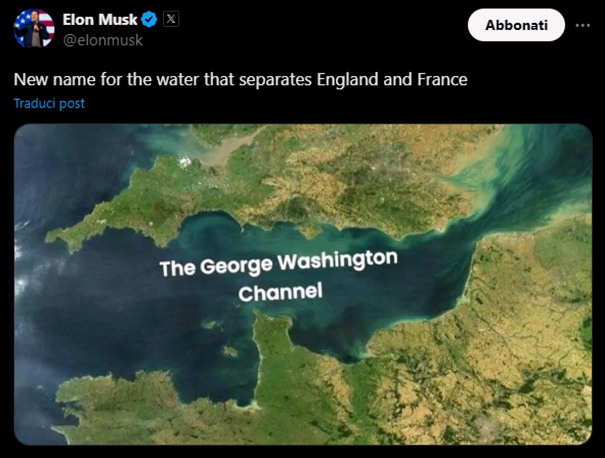 Dopo il Golfo del Messico, che dovrebbe diventare Golfo d'America, il patron di X - braccio destro di Donald Trump alla Casa Bianca - ha proposto di ribattezzare anche il Canale della Manica, tra Francia e Regno Unito, con il nome di “Canale George Washington”.