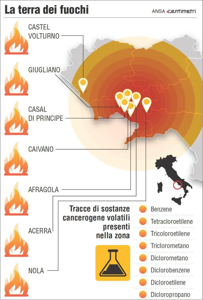 Con il termine Terra dei Fuochi si intende un territorio tra la provincia di Napoli e Caserta comprendente 90 comuni con una popolazione di 2,9 milioni di abitanti. Il nome è legato al fenomeno dei roghi tossici appiccati volontariamente e non per smaltire illegalmente rifiuti urbani e speciali sversati sul territorio spesso in terreni privati.