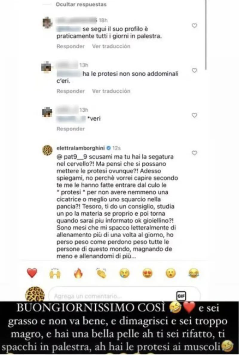 Oltre alle accuse di essersi sottoposta all'intervento chirurgico noto come “Brazilian Butt Lift”, per rendere più prosperoso il lato b, un utente sui social ha attaccato Elettra Lamborghini sostenendo che si sia rifatta anche gli addominali.