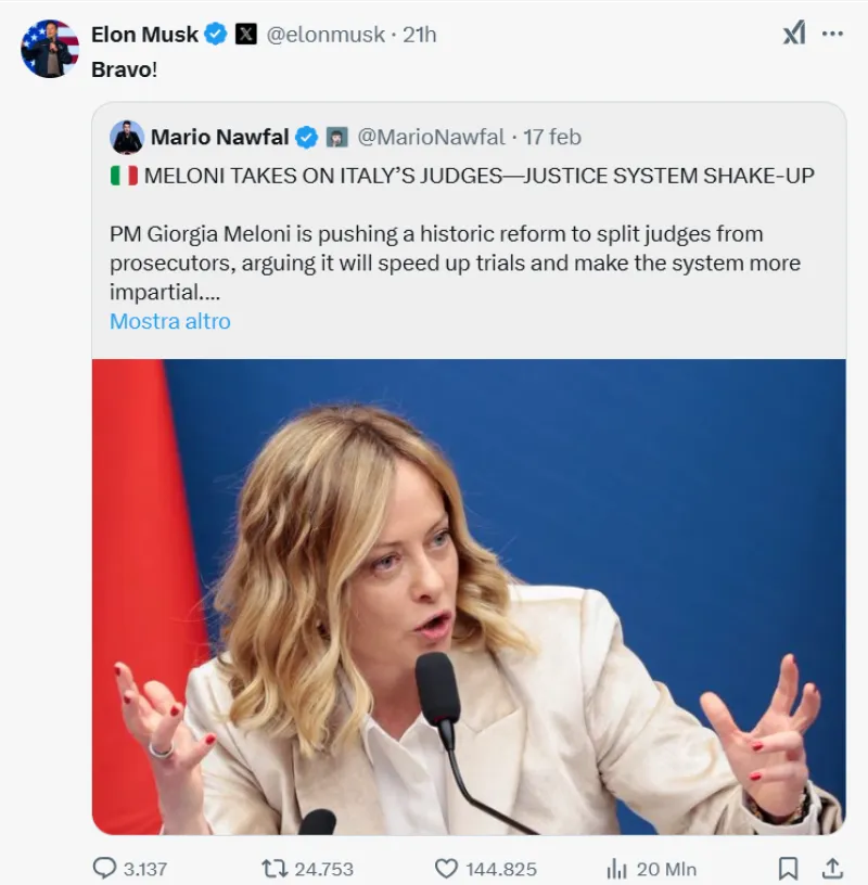 Il ‘Bravo’ è riferito al post di un giornalista e influencer australiano, spesso condiviso da Musk sul suo profilo X, in cui veniva criticato il sistema giudiziario italiano e si promuoveva la separazione delle carriere.