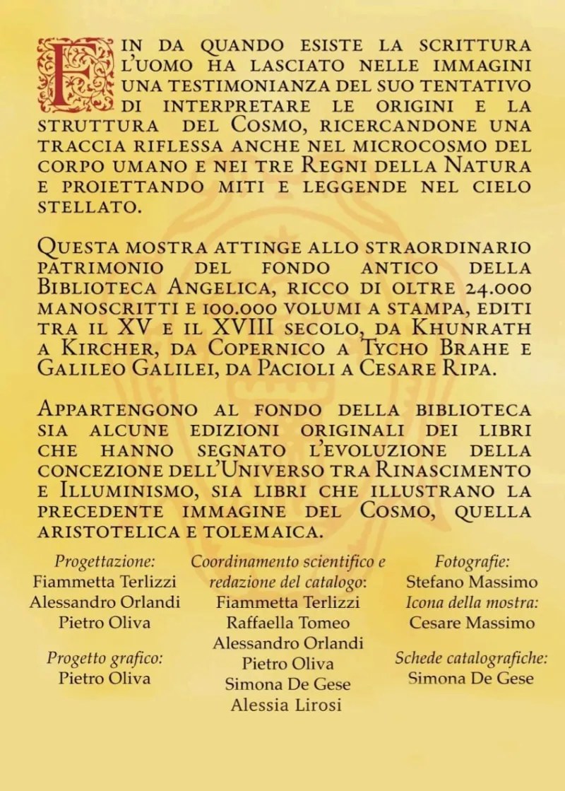La mostra, progettata dal Prof. Pietro Oliva (docente Unicusano), si svolgerà tra gli affascinanti scaffali della Biblioteca Angelica, che custodisce un patrimonio inestimabile di testi antichi e opere rare. Questa location storica diventa il palcoscenico perfetto per un viaggio attraverso i secoli, in cui i visitatori potranno ammirare mappe stellari, trattati alchemici, illustrazioni simboliche e volumi rari che raccontano come, nel corso del tempo, l'uomo ha cercato di interpretare la vastità del cosmo. L’esposizione si concentra sul concetto di "microcosmo" e "macrocosmo", simbolo dell’unione tra l’essere umano e l’universo, un tema centrale nell’antica cosmologia.