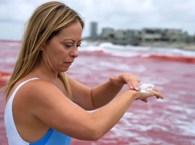 Tra i leader politici, c’è poi anche la presidente del Consiglio, Giorgia Meloni che si spalma la crema protettiva sulle mani, tra le onde rosse del mare.