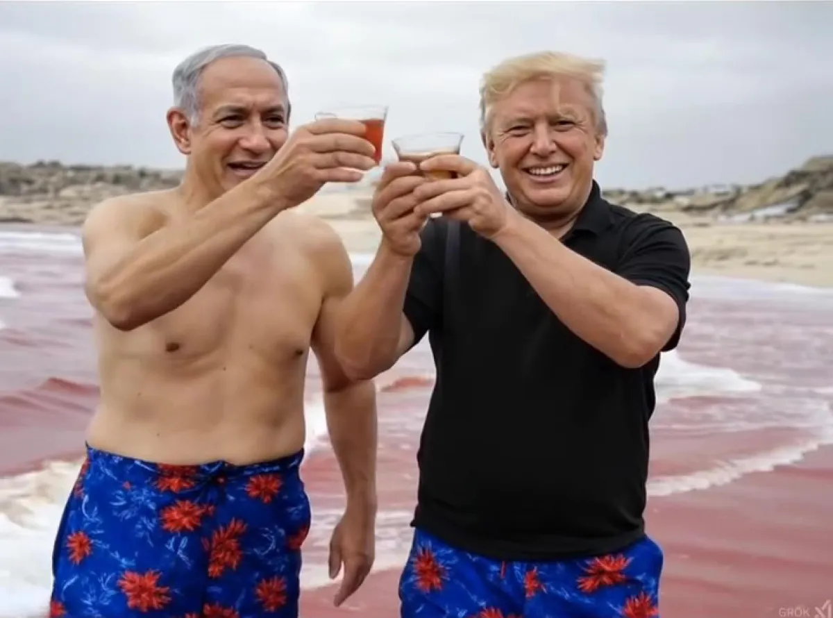Un mare rosso sangue, le macerie della guerra alle spalle e i leader mondiali che bevono drink e si spalmano crema abbronzante a vicenda. Il filmato, pubblicato due settimane fa, è stato riproposto ieri dall’autore sul suo profilo Instagram diventando virale in poche ore.
