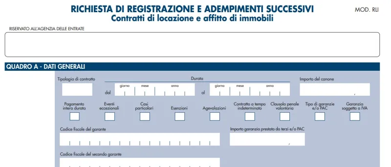 Il modello RLI è composto da 5 quadri (A - E). Nel quadro A, si deve riportare il codice fiscale del soggetto che richiede la registrazione e indicare il codice corrispondente alla tipologia del contratto.