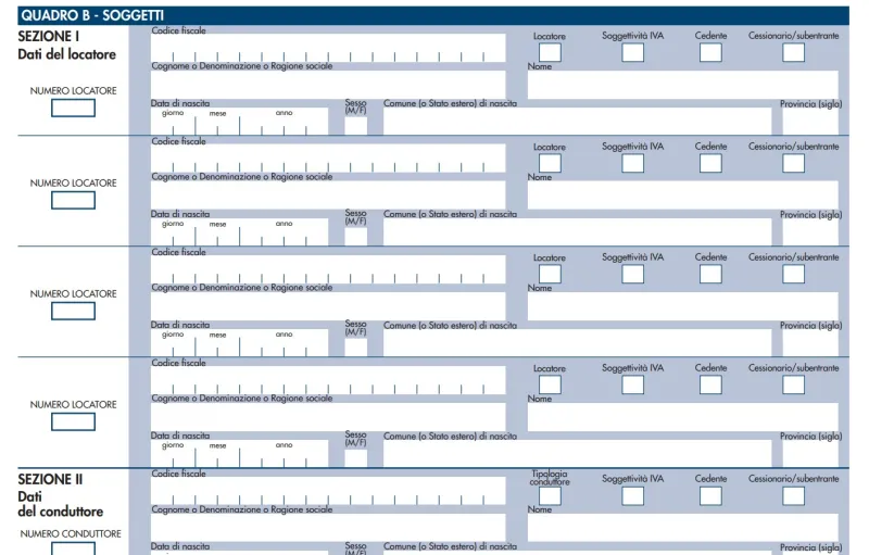 Nel quadro B, invece, si devono inserire tutti i dati del locatore e del conduttore.