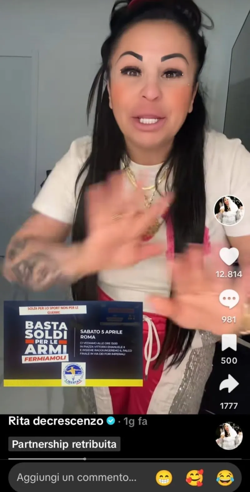 Il video pubblicato, ieri, su Tik Tok dall'influencer napoletana Rita De Crescenzo, in cui invita tutti i suoi follower (che sono quasi due milioni) ad aderire alla manifestazione contro il piano di riarmo europeo organizzata dal Movimento 5 Stelle, sabato 5 aprile a Roma, è diventato un caso politico.