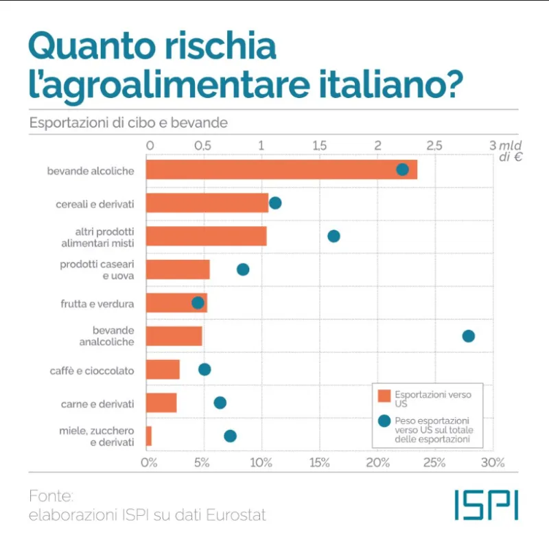I più preoccupati sono senza dubbio gli imprenditori del comparto food e bevande. Nei giorni scorsi hanno fatto molto discutere, ad esempio, le minacce relative ai dazi sul vino (Trump aveva ipotizzato tariffe del 200%) che salgono come tutti gli altri prodotti europei al 20%. L’export del vino vale circa 2 miliardi e impiega quasi cinquecentomila addetti. Il danno economico è stimato in centinaia di milioni di euro.