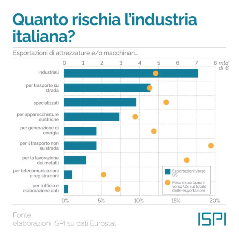 Quello statunitense rappresenta il terzo mercato più importante dell’export italiano. Nel 2024 valeva da solo 73 miliardi di euro. I settori che soffriranno maggiormente dell’introduzione dei dazi americani saranno quelli più vocati all’export, come le eccellenze agroalimentari, i vini (il 39% delle esportazioni è diretto negli Usa), ma anche le automobili e il comparto lusso.