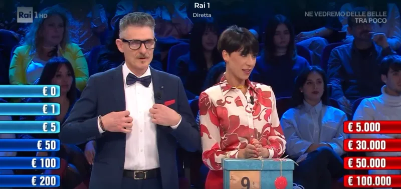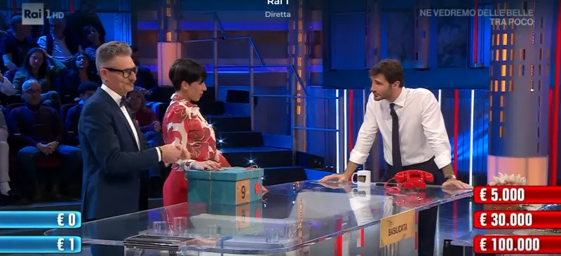 Nel pacco appena lasciato c'è 1 euro, quindi ha fatto bene a fare il cambio. Nel pacco numero 13 delle Marche ci sono 50 euro, perciò resta in gioco un solo pacco blu da zero euro e quattro pacchi rossi, da 5mila euro, 30mila euro, 100mila euro e 200mila euro.