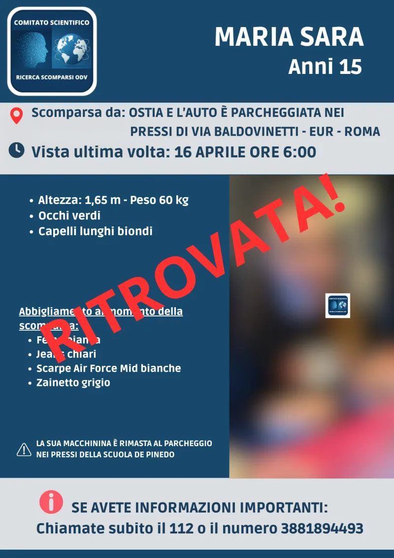 È stata ritrovata Maria Sara Dicu, la quindicenne scomparsa nella giornata di martedì 16 aprile da Roma.