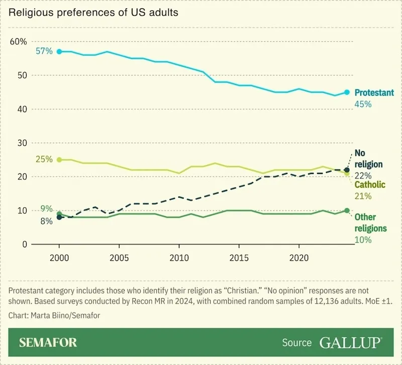 Con Trump, il cristianesimo è diventato una narrazione identitaria. I giudici cattolici da lui nominati alla Corte Suprema - Alito, Barrett, Kavanaugh - sono stati decisivi nell'abolire il diritto federale all'aborto. E lo stesso Trump, poco praticante ma molto strategico, ha saputo utilizzare la religione come grimaldello per parlare a una parte dell'America spaventata dai cambiamenti.