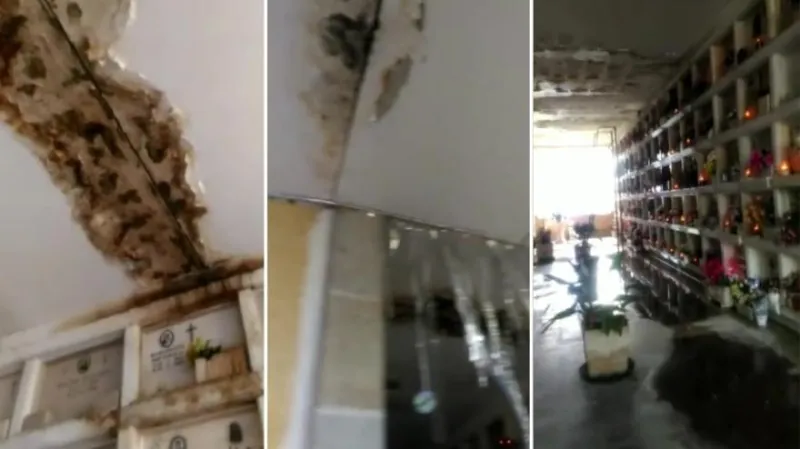I pavimenti sono completamente allagati, con acqua stagnante che galleggia tra detriti, foglie secche e petali marciti. Dalle infiltrazioni dei soffitti – ormai ridotti a un colabrodo – le gocce cadono incessanti, creando rivoli che scorrono sulle pareti e sulle finestre, mentre i loculi si trasformano in cascate di acqua sporca che inonda fotografie, ceri e fiori. In alcuni casi, l’acqua che piove dal soffitto si mescola agli escrementi dei piccioni, regalando ai visitatori un’esperienza olfattiva degna di una discarica.