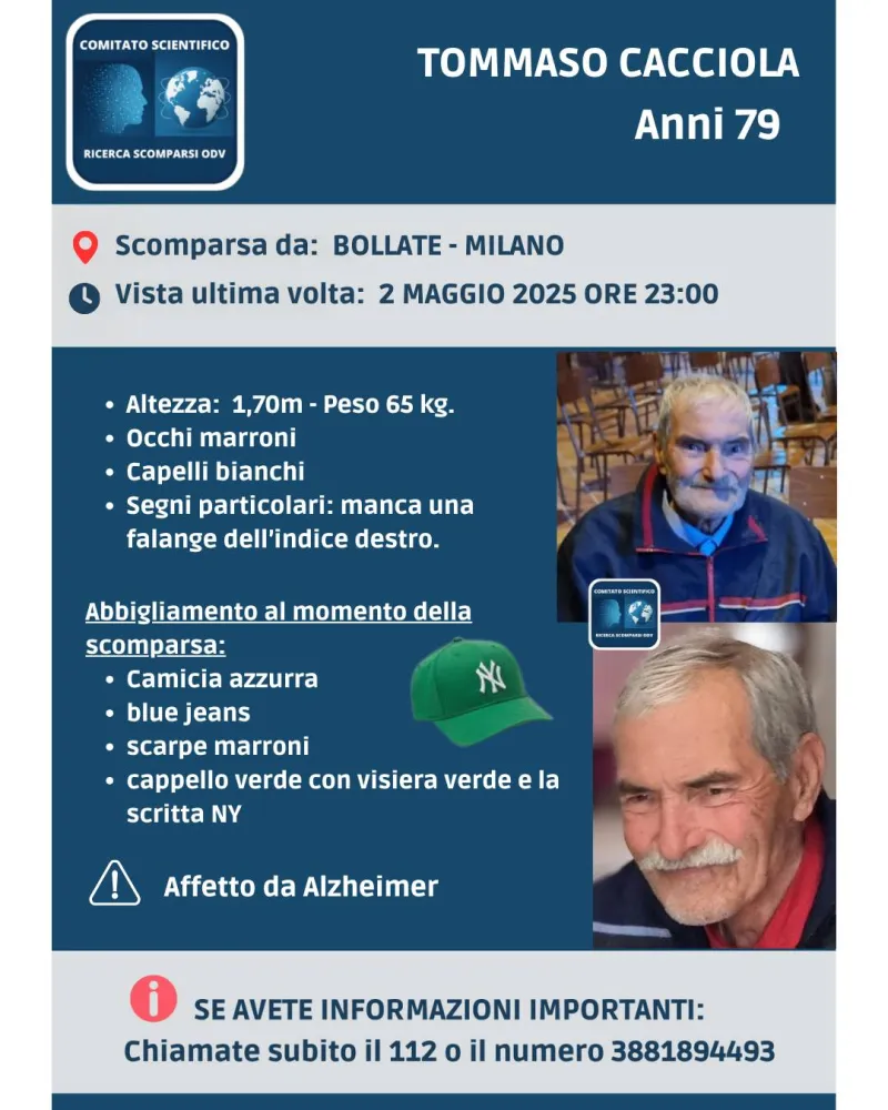 Sono ore difficili per i familiari di Tommaso Cacciola, settantanovenne scomparso da Bollate, in provincia di Milano, lo scorso 2 maggio 2025.