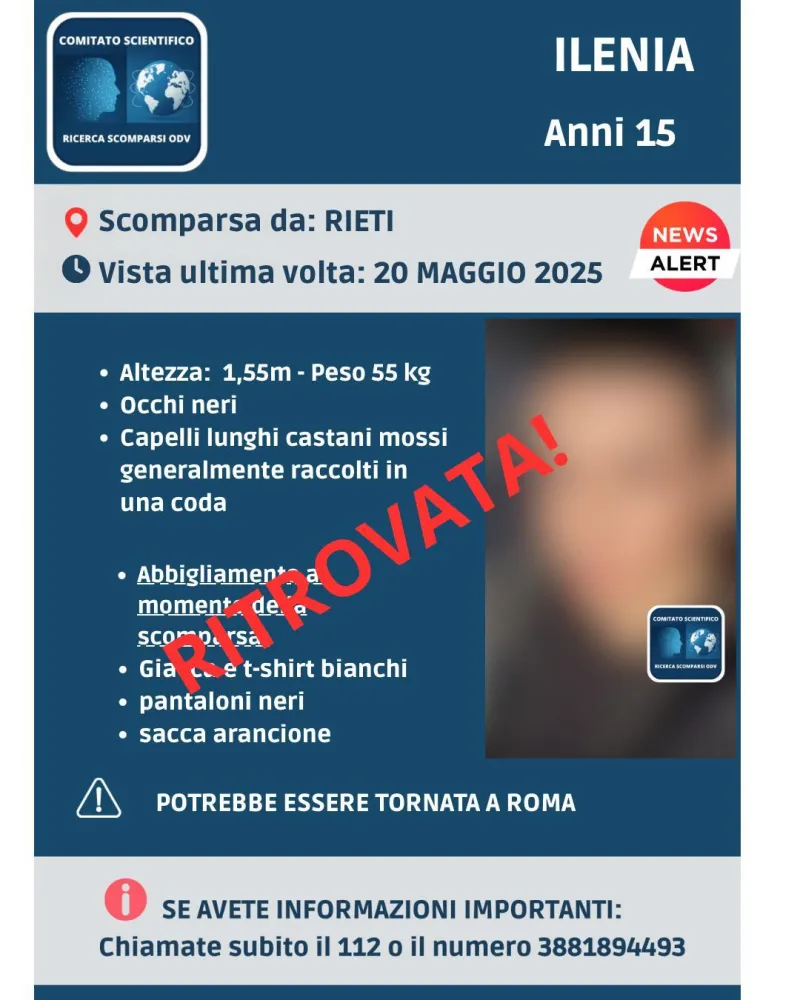 “Ilenia è stata ritrovata oggi dalla polizia del comando locale di Roma, sezione Prenestino”, dichiara a Tag24 Gaia Pensieri, presidente del Comitato Scientifico Ricerca Scomparsi OdV.