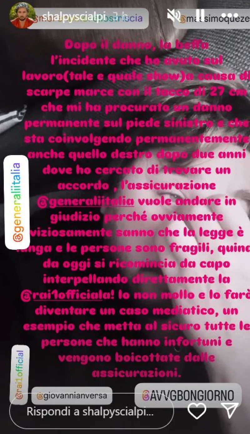 Il cantante afferma pubblicamente che l'Assicurazione Generali Italia ha deciso di andare in giudizio per stabilire se il danno sia stato causato dal suo lavoro in trasmissione.