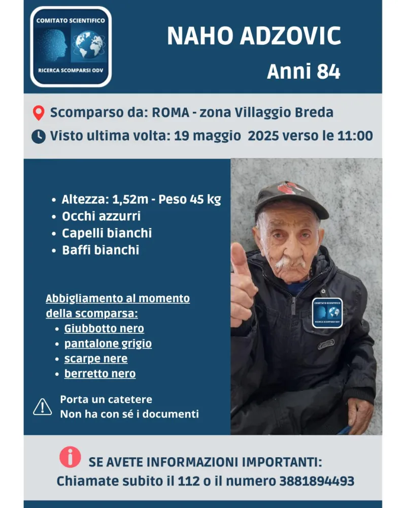 Purtroppo, l'ottantatrenne si è allontanamento dall'abitazione condivisa con la moglie e non ha più fornito sue notizie ai familiari dal 19 maggio 2025.