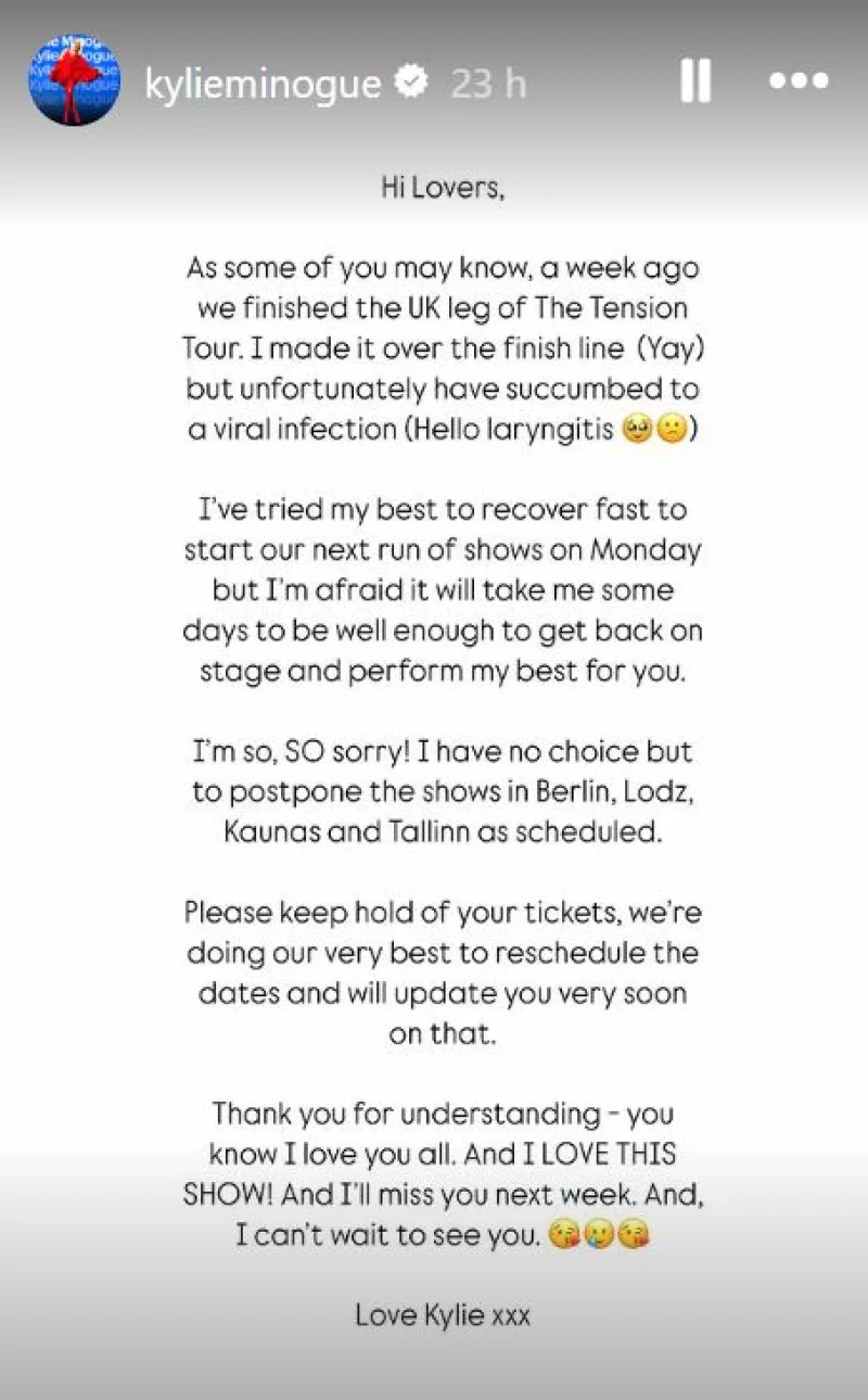 "Ho fatto del mio meglio per riprendermi in fretta", ha scritto Kylie in una dichiarazione, "ma temo che ci vorranno alcuni giorni prima che mi riprenda abbastanza bene da poter tornare sul palco ed esibirmi al meglio per voi".