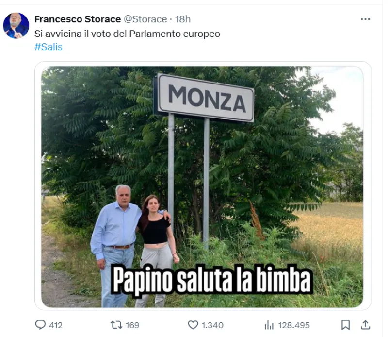 Nel post in questione, Storace aveva condiviso una foto di Ilaria Salis con il padre Roberto sotto il cartello della città di “Monza” accompagnata dal messaggio: “Papino saluta la bimba” e dalle parole “si avvicina il voto al Parlamento Europeo”.