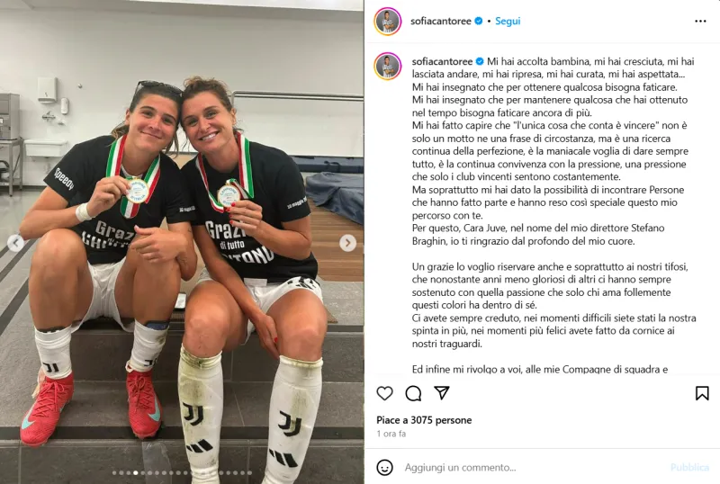Nel suo post su Instagram traspare tutto l’amore per i colori bianconeri e il forte legame con le sue compagne di squadra. Un messaggio intenso, destinato a rimanere nel cuore di chi l’ha vista crescere ed esplodere, improvvisamente, calcisticamente parlando.