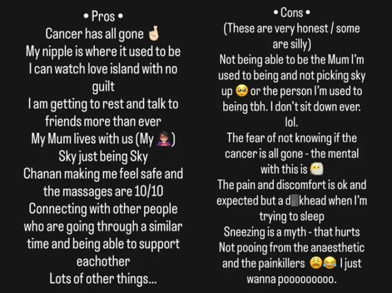 Con la solita ironia che la contraddistingue, Jessie J ha condiviso in un post i pro e i contro di questa fase post-operatoria, scherzando sul fatto che "per fortuna" il suo capezzolo sta ancora al suo posto, ma che purtroppo il dolore è ancora molto forte, soprattutto la sera prima di addormentarsi e che le manca poter prendere in braccio il suo bambino.