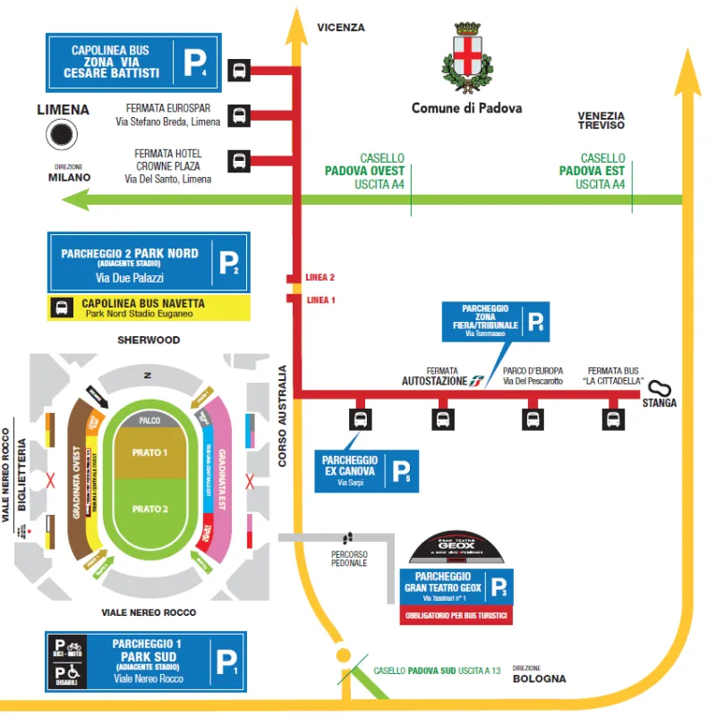 Si segnala che i bus turistici devono obbligatoriamente parcheggiare al Park Gran Teatro Geox. Per chi preferisce lasciare l'auto più lontano e usufruire del trasporto pubblico, sono stati predisposti parcheggi serviti da bus navetta.