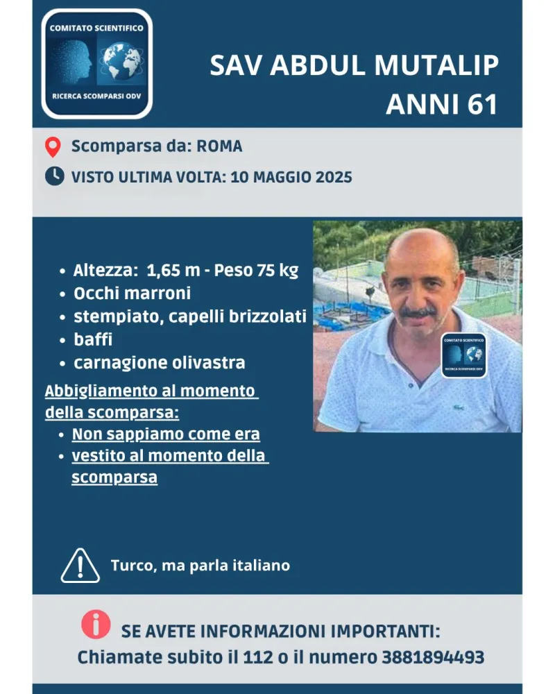 Sono mesi di apprensione per Sav Abdul Mutalip, il sessantenne scomparso da Roma lo scorso 10 maggio 2025 in circostanze ancora da accertare.