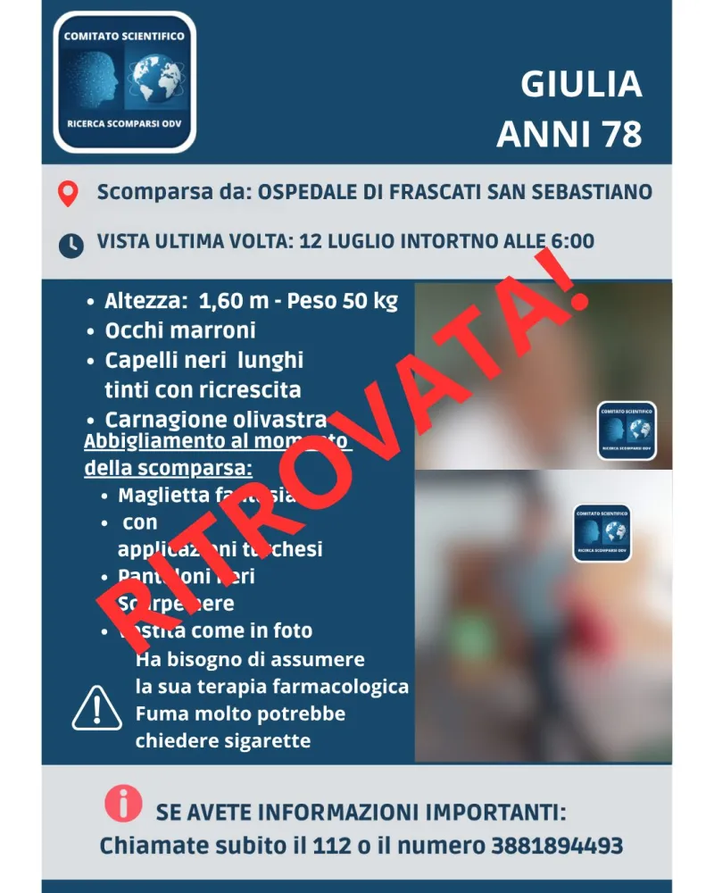 Conclusione positiva per Giulia Muggiri, la settantottenne scomparsa da Frascati, in provincia di Roma, il 12 luglio 2025 in circostanze allarmanti.