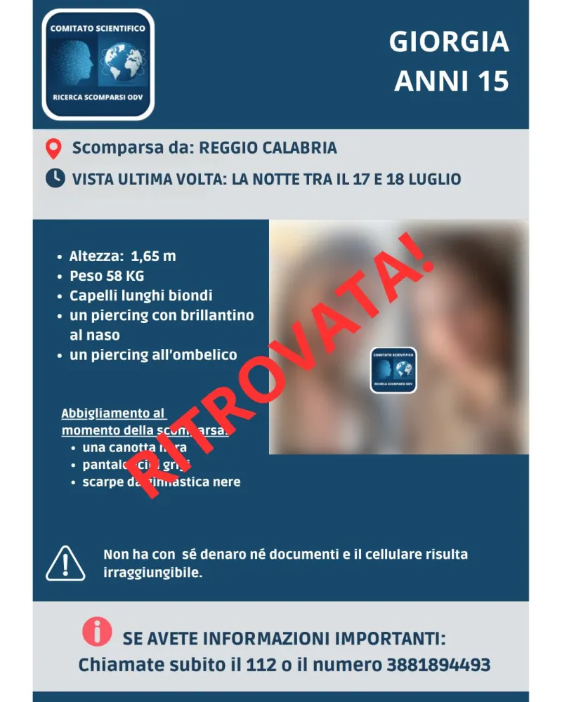 Fine delle ricerche per Giorgia De Nuccio, l’adolescente scomparsa da Reggio Calabria il 18 luglio 2025, in circostanze allarmanti.
