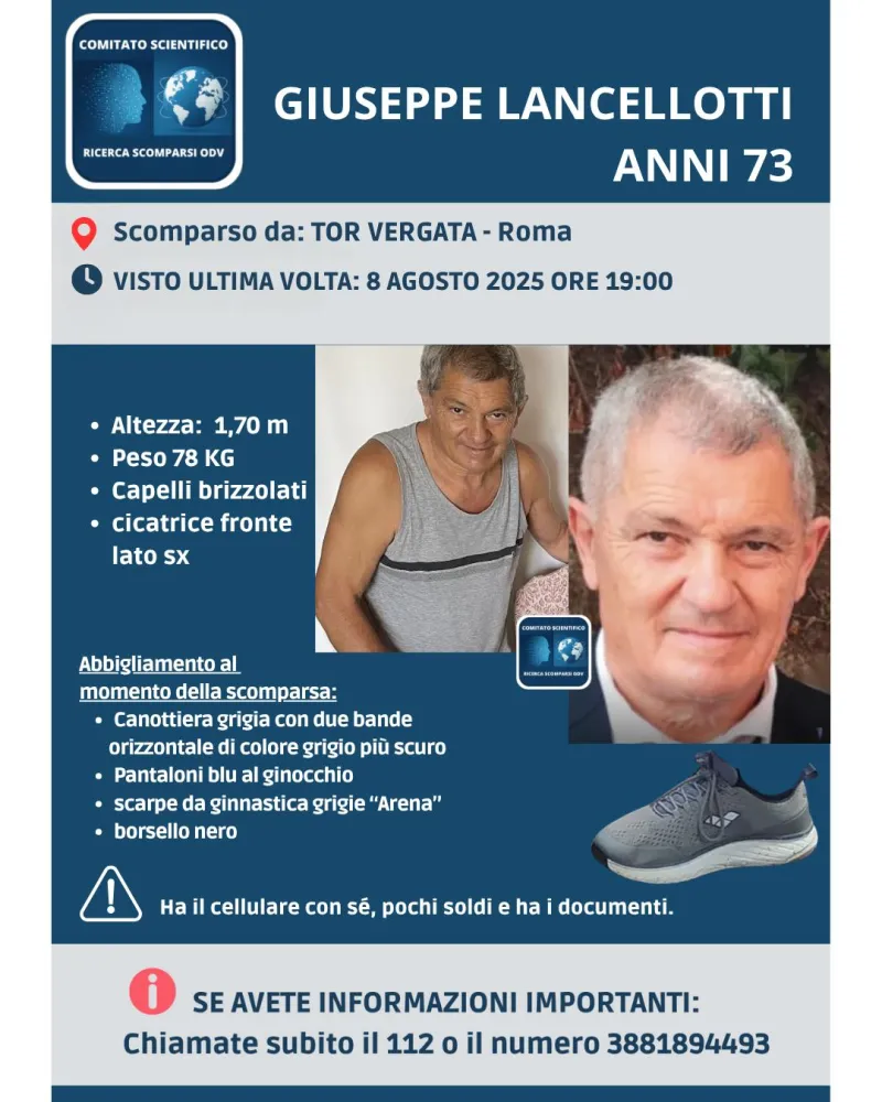 Sono ore di apprensione per Giuseppe Lancellotti, l’anziano scomparso da Roma l’8 agosto 2025, in circostanze allarmanti.