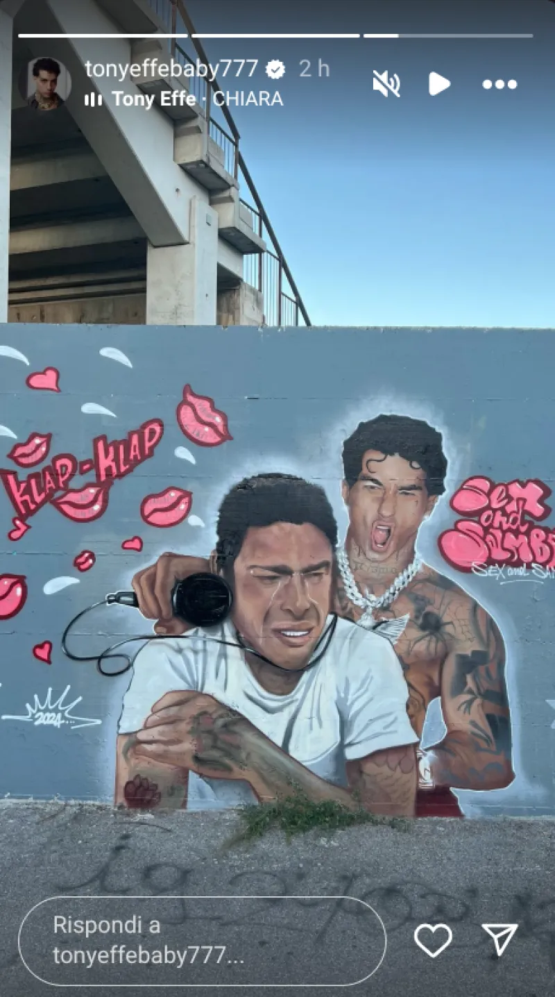 L'immagine immortala un murales nel quale sono disegnati tutti e due: Fedez che piange e Tony che gli passa il microfono urlando alle sue spalle.