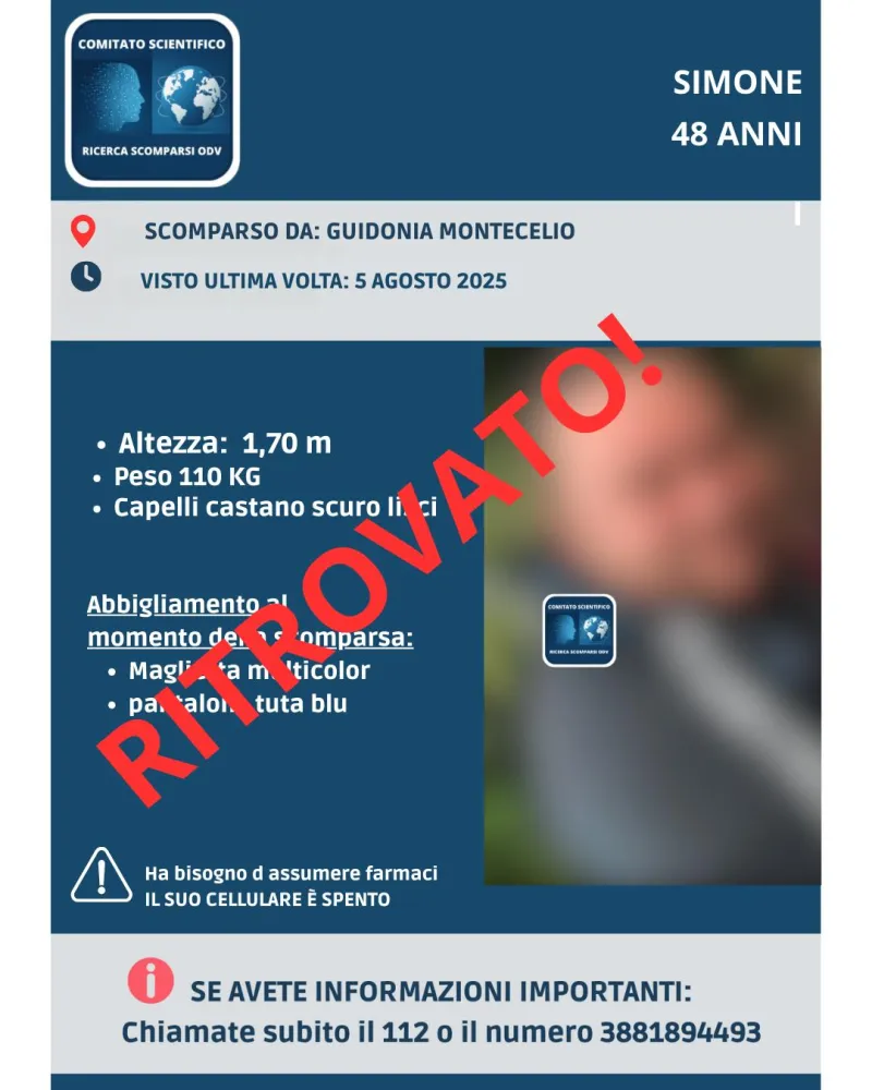 «Le confermo che Simone Colantoni è stato ufficialmente ritrovato: si era allontanato da Guidonia da quasi due settimane» – spiega il referente.