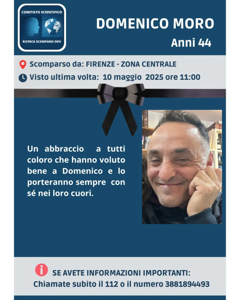 Tragico epilogo per Domenico Moro, scomparso da Firenze il 10 maggio 2025 in circostanze allarmanti.