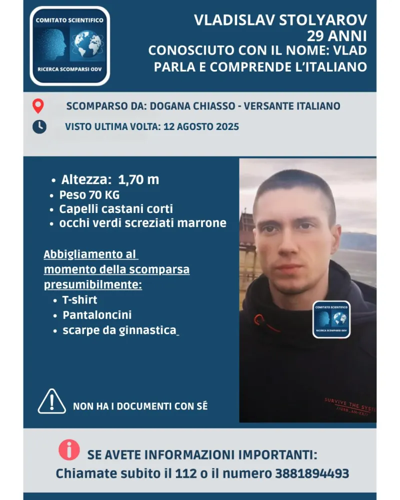 Proseguono le ricerche di Vladislav Stolyarov, il ventinovenne scomparso da Chiasso, comune del Canton Ticino, il 12 agosto 2025.
