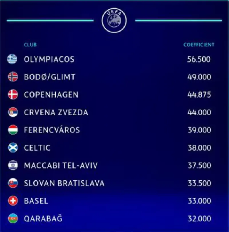 In questo scenario, l’Olympiacos, campione di Grecia, è risultato il club con il miglior coefficiente tra i vincitori nazionali delle federazioni classificate dall’11° al 55° posto UEFA.