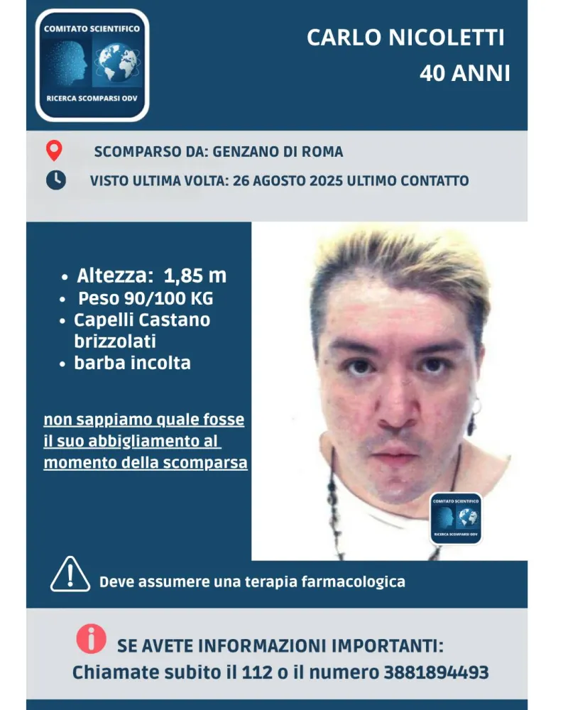 Proseguono le ricerche di Carlo Nicoletti, il quarantenne scomparso da Genzano, in provincia di Roma, lo scorso 26 agosto 2025.