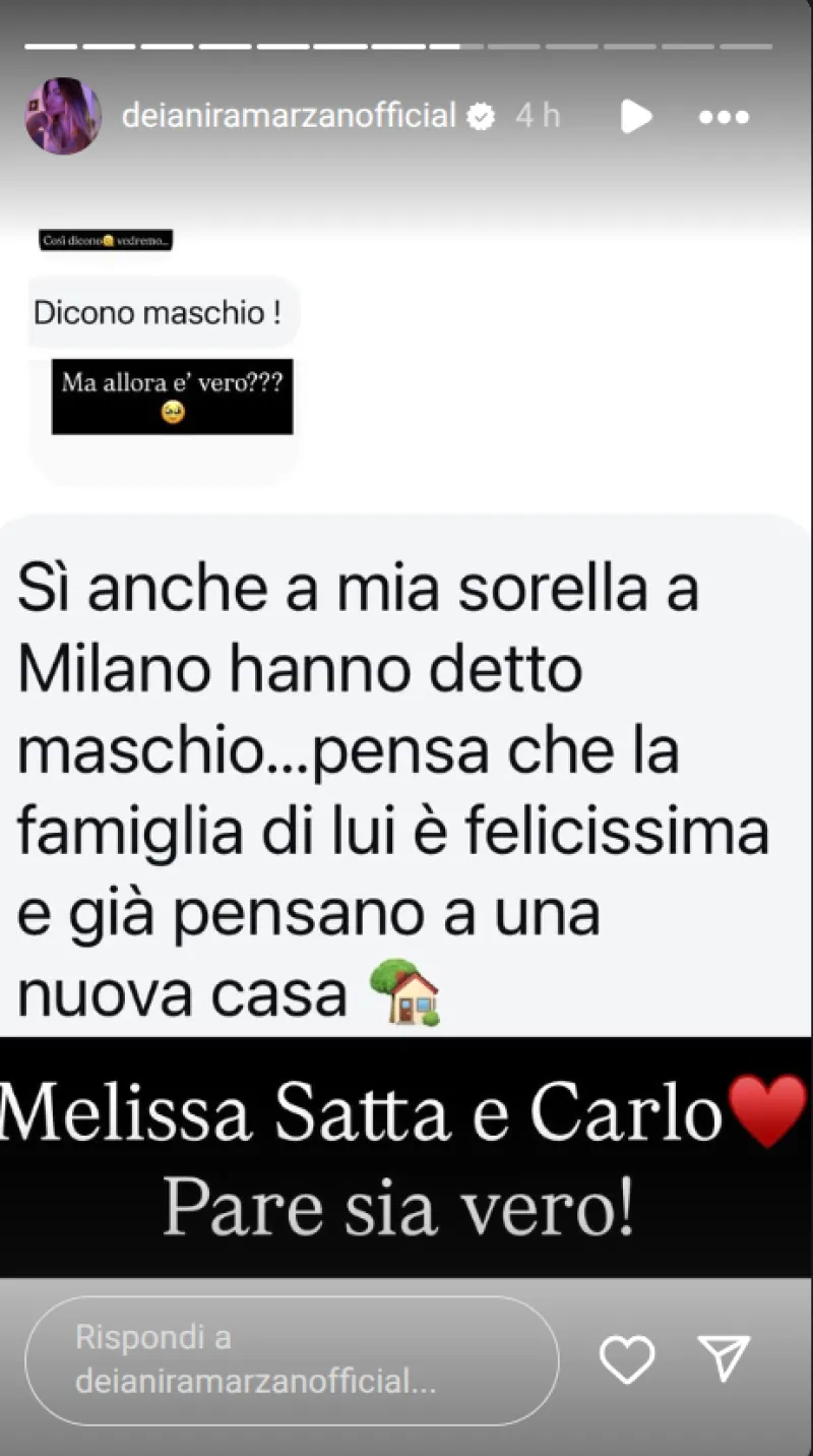Come spesso succede, l'esperta dei gossip, seguitissima su Instagram, Deianira Marzano ha diffuso nelle sue storie le voci e i messaggi che le sono arrivati. Si dice non solo che Melissa sia incinta, ma anche che starebbe arrivando un altro maschietto.
