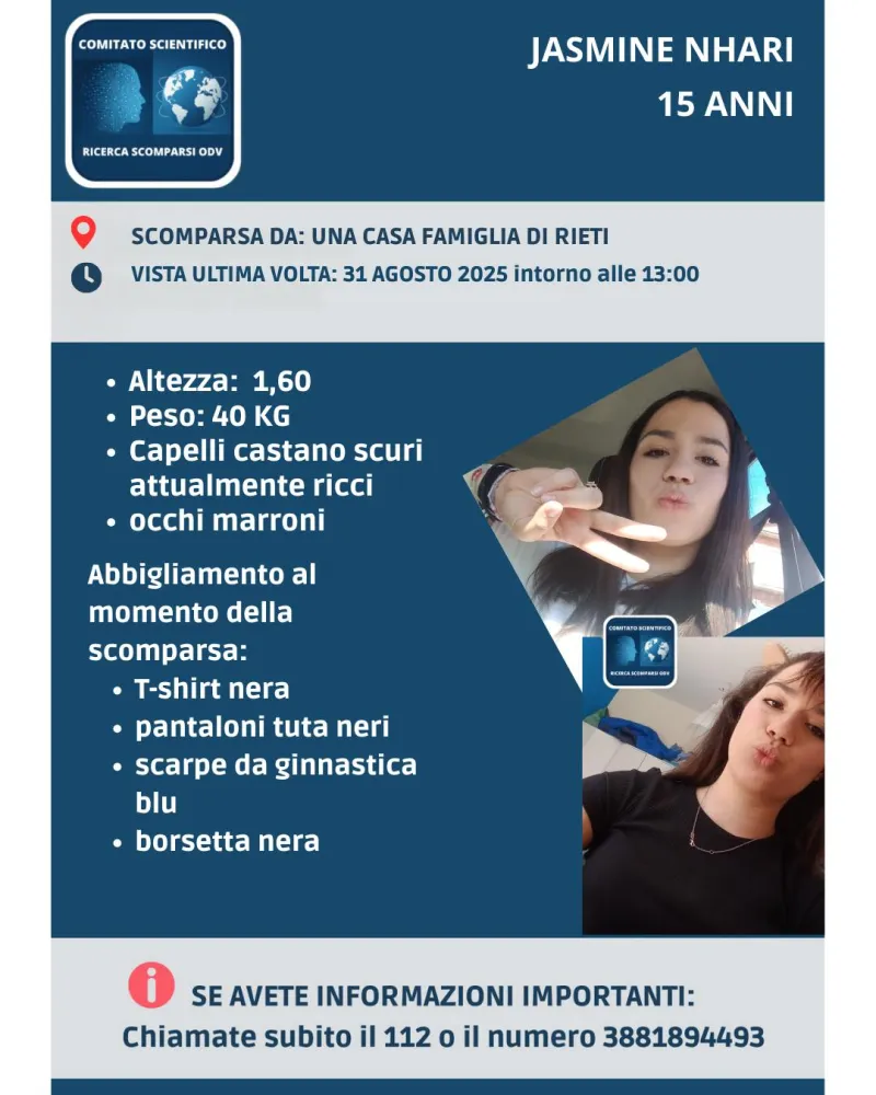 Sono giorni di forte preoccupazione per Jasmine Nhari, l’adolescente scomparsa da Rieti il 31 agosto 2025 in circostanze ancora da chiarire.