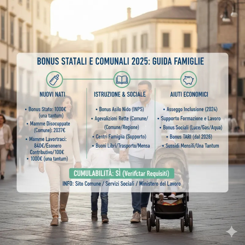 Il supporto economico alle famiglie non arriva solo dallo Stato, ma anche dai Comuni. È importante riflettere sui bonus rivolti alle famiglie che coprono un arco di tempo dalla nascita fino all'adolescenza. In molti casi, si può arrivare a percepire anche un doppio bonus e numerose agevolazioni, grazie alla presenza attiva di Comuni italiani che ogni anno erogano contributi specifici per sostenere famiglie, anziani, studenti e lavoratori.