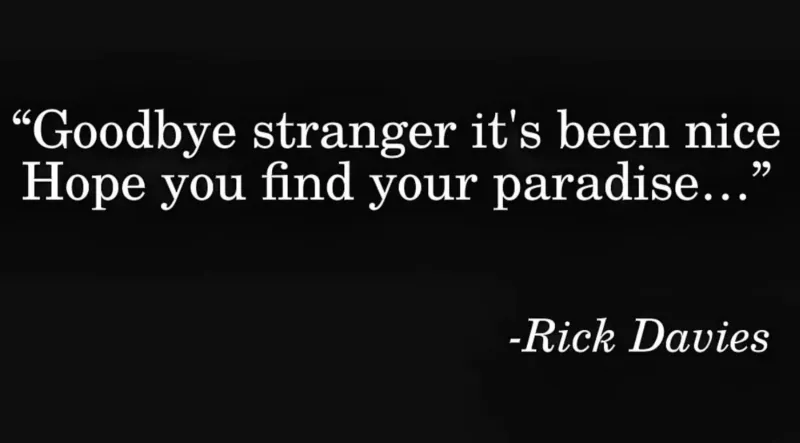 Rick Davies non aveva avuto figli, ma una moglie, Sue che amava moltissimo e con la quale ha condiviso un’esistenza intera. L’artista lasca l’adorata donna che dal 1977 era diventata sua moglie, e che dal 1984 era anche la manager dei Supertramp.