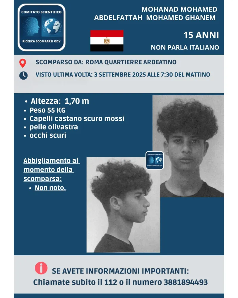 Si cerca con urgenza Mohanad Mohamed Abdelfattah Ghanem, il quindicenne scomparso da Roma lo scorso 3 settembre 2025 in circostanze che destano grande preoccupazione.