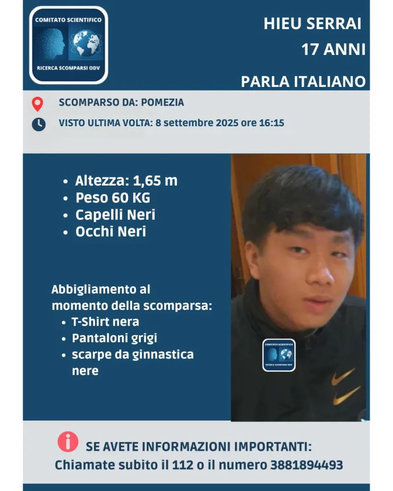 Sono ore difficili per i familiari di Hieu Serrai, il diciassettenne scomparso da Pomezia, in provincia di Roma, l’8 settembre 2025.